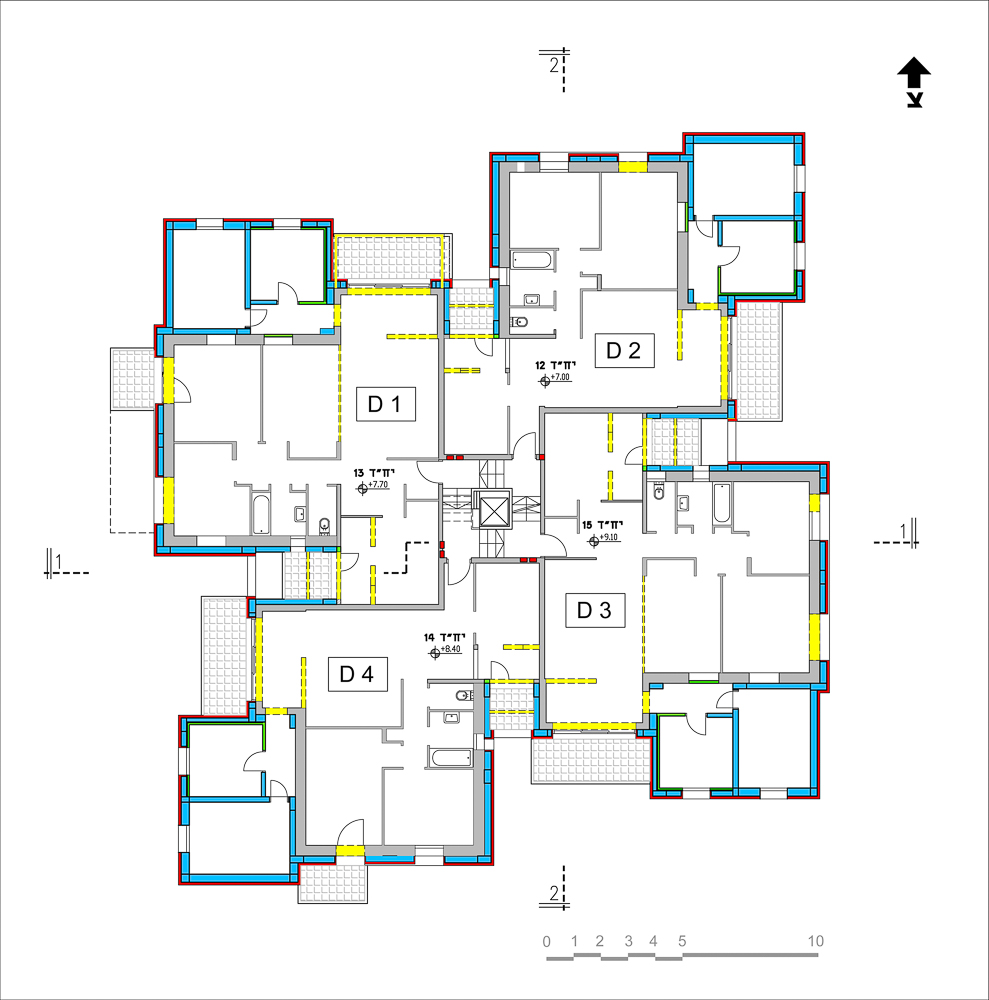 Project: Refurbishment and Extension of 1980-s Apartments Building within a Municipal Program for Urban Renovation. Location: Eshkol Bvld., Jerusalem. Area: 3,620 m2. Phase: Building Permit. Year: 2017. Developer: Nof Modiin Investments. Architect: Ella Zilberman
